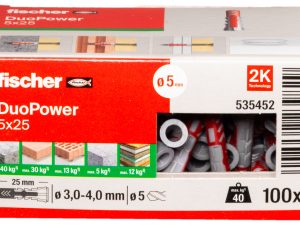 Een Duo power plug M5x25 is een slimme, zelfactiverende plug die zich aanpast aan het bouwmateriaal. Dankzij de combinatie van twee componenten grijpt de plug zich stevig vast in zowel massieve als holle wanden. Ideaal voor toepassingen in steen, beton, gips, gasbeton en meer. Eenvoudige montage en hoge belastbaarheid. Bij XXLDraadstang krijgt u de hoogste kwaliteit Duo power pluggen. Afbeeldingsbron: fischer group of companies.