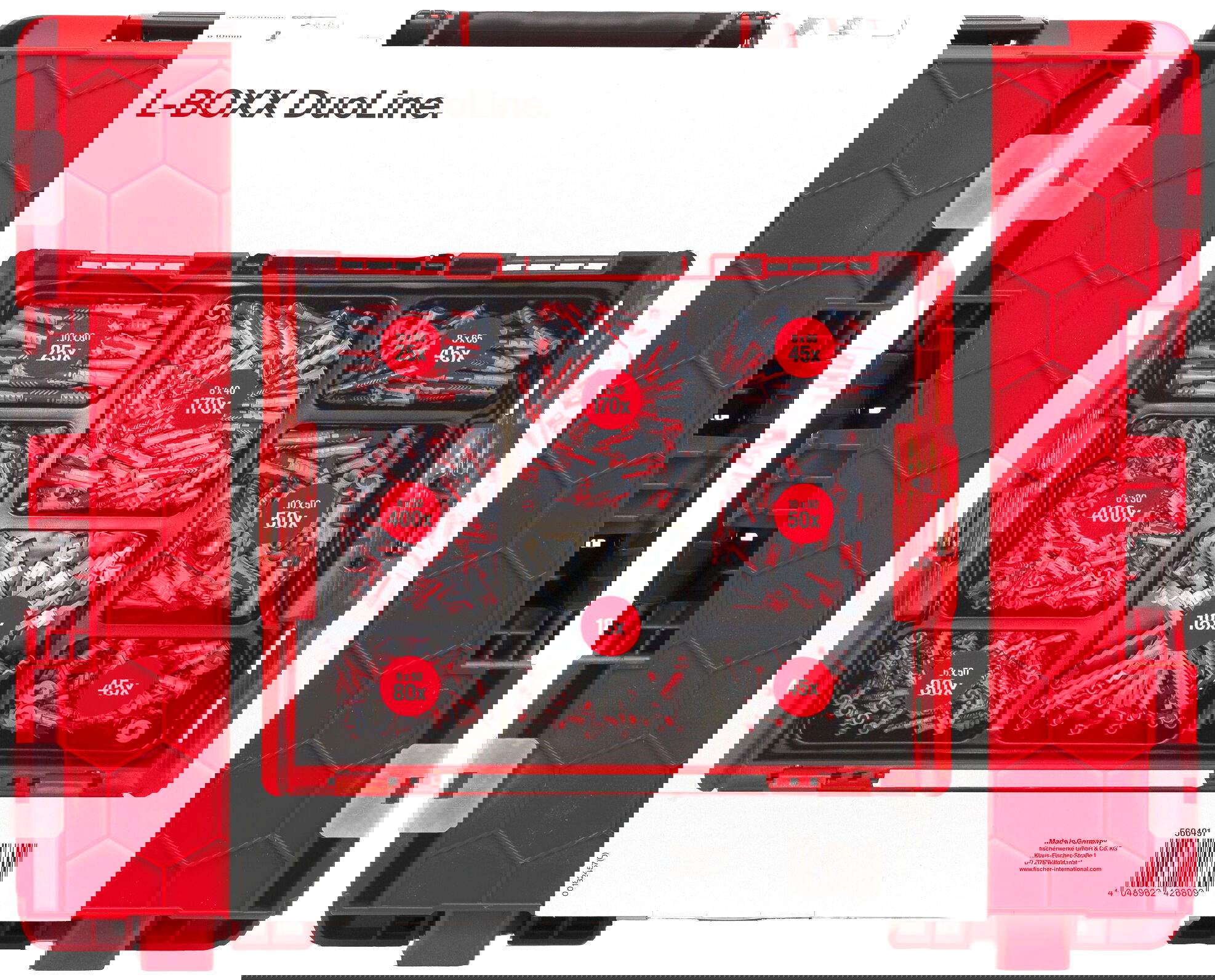 De Fischer Duoline L-Boxx 102 is een complete assortimentsbox met hoogwaardige Fischer pluggen en schroeven, perfect voor professionals en doe-het-zelvers die betrouwbaarheid en overzicht willen combineren. Deze praktische L-Boxx bevat een zorgvuldig samengesteld assortiment van Fischer Duopower en Duotec pluggen, innovatieve bevestigingsoplossingen die geschikt zijn voor uiteenlopende bouwmaterialen zoals beton, baksteen, gipsplaat en natuursteen. Dankzij de intelligente Duoline-technologie past elke plug zich automatisch aan het bouwmateriaal aan en combineert ze spreiden, vouwen en knopen voor maximale houdkracht en veiligheid. De hoogwaardige kunststof pluggen garanderen een sterke verankering, zelfs bij zware belastingen, terwijl de bijgevoegde schroeven perfect op maat zijn afgestemd voor optimale montage. De robuuste L-Boxx 102 biedt een overzichtelijke indeling en is eenvoudig stapelbaar en transporteerbaar, ideaal voor gebruik op de bouwplaats of in de werkplaats. Met de Fischer Duoline L-Boxx 102 beschikt u altijd over de juiste bevestiging binnen handbereik: efficiënt, veilig en professioneel. Bij XXLDraadstang bent u verzekerd van originele Fischer kwaliteit en duurzame bevestigingsmaterialen. Afbeeldingsbron: fischer group of companies.